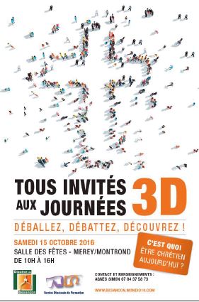Dans un deuxième temps, participez à la « Journée 3D » avec l’évêque Mgr Bouilleret, samedi 15 octobre 2016 de 10h à 16h, salle des fêtes de Mérey-sous-Montrond (prévoir son pique-nique). Tentez ces rencontres «3D» , vous êtes tous invités !
