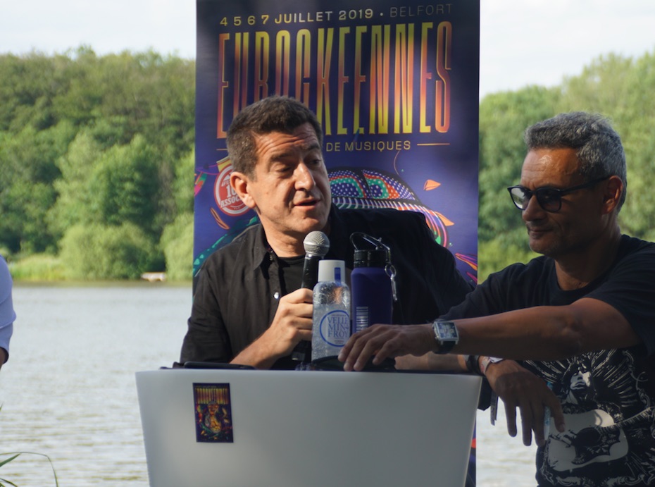 La conférence bilan du festival des Eurockéennes comprenait Matthieu Pigasse (photo 1), président de l’association Territoire de Musiques organisatrice des Eurockéennes, Jean-Paul Roland (photo 2), directeur de cette même association, Kem Lalot (photo 4), unique programmateur de cette édition du festival, Frédéric Adam (photo 3), responsable partenariat du festival et Marie-Claude Chitry-Clerc, vice-présidente du département du Territoire de Belfort.