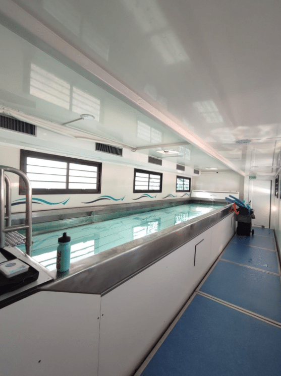 Le bassin mobile , installé dans une remorque, offre tous les équipements d’un bassin classique : 6 cabines de déshabillage, une douche, des toilettes, un local technique, un local pour le Maitre-Nageur-Sauveteur, et un bassin de 8m par 2.10m avec équipé d’un plancher à la profondeur réglable pouvant aller jusqu’à 1.40m. Cet équipement est parfaitement accessible aux personnes à mobilité réduite.