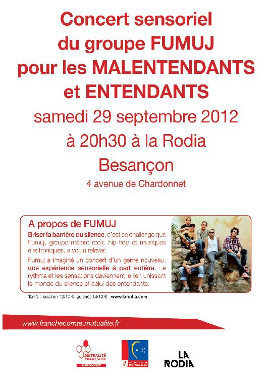 M. Bezombes : Tout d’abord, l’accent est mis sur le concert des FUMUJ qui aura lieu le 29 septembre conçu pour les personnes sourdes, malentendantes et entendantes Pour réussir son pari, FUMUJ met en place des dispositifs sensoriels inédits : «forêt lumineuse» sur scène, deux cheminées gonflables de 2,5m de hauteur placées en salle sur lesquelles le public peut poser ses mains et ressentir les vibrations, applaudisseurs gonflables distribués au public dans la même optique. De même une batterie lumineuse créée spécifiquement pour le spectacle permet au public de voir précisément ce que joue le batteur. Le chanteur s’adresse également au public à travers le langage des signes. Cette approche s’inscrit dans la démarche de prévention de la Mutualité dont la volonté est d’informer sur les risques auditifs sans interdire de participer à la fête. Puis viendra le temps des concerts pédagogiques « Peace and Lobe » au mois de novembre sur les risques auditifs auprès des lycéens et collégiens du Grand Besançon. Enfin, d’une manière générale c’est la démarche globale de la Rodia faite en matière de prévention qui nous rapproche. Ainsi prochainement, la faculté de médecine de Besançon et le service ORL de l’hôpital Jean Minjoz vont étudier les habitudes d’écoute des différents publics de la Rodia à travers la mise à disposition de deux étudiants en médecine spécialement détachés pour l’occasion. Voilà donc un partenariat efficace, bien entendu !